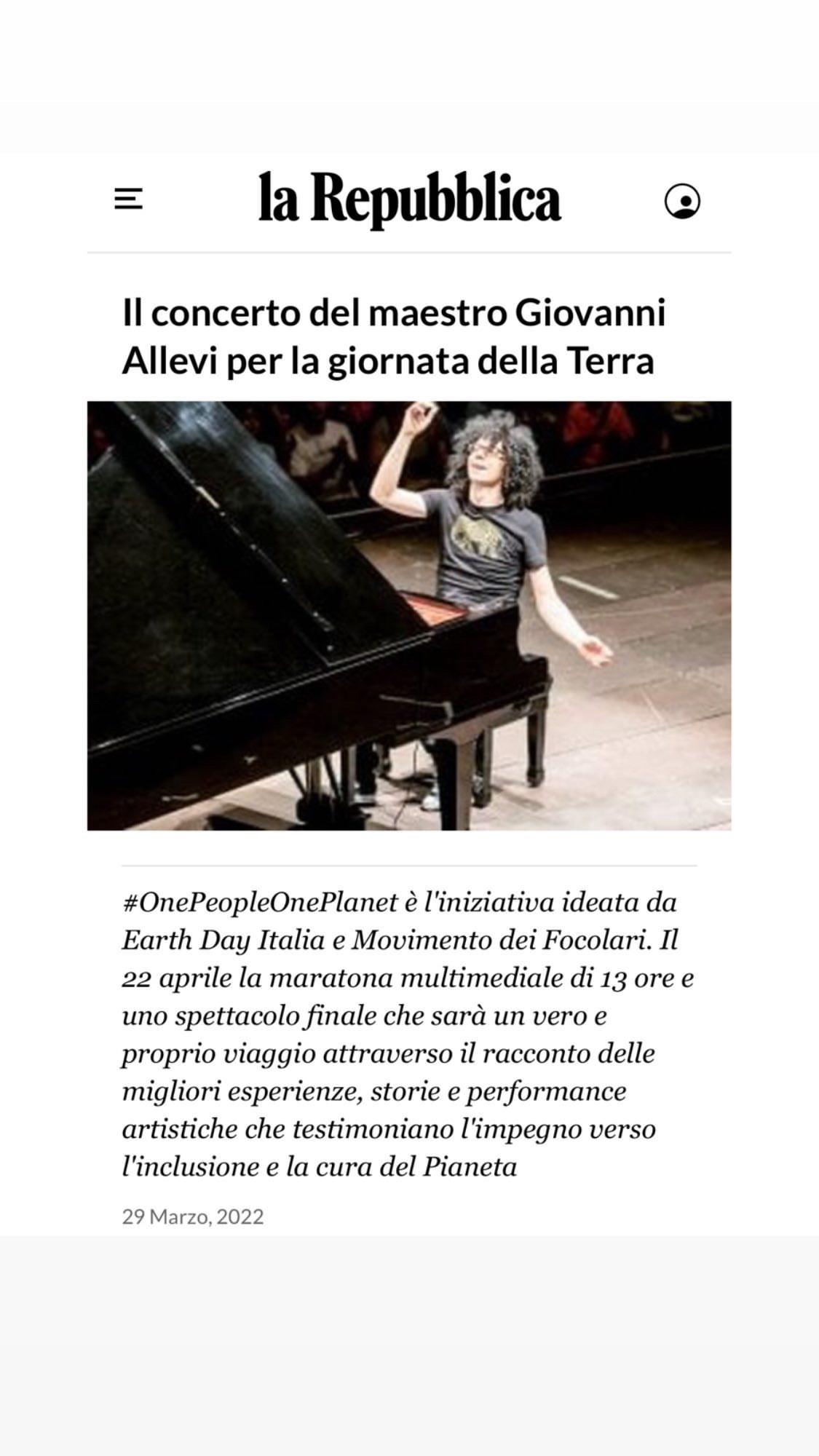 During a live stream from Multisala Gloria in Milan, they announced the traditional Earth Day Italy Concert. It hosted renowned artists such as Giovanni Allevi and Tony Esposito. The concert was held at the Nuvola of Fuksas, made available by Roma Capitale for the Earth Day celebrations. The show was created by Tiziana Tuccillo, coordinator of the artistic and cultural committee of Earth Day, and directed by Maestro Giovanni Allevi, who wanted to dedicate it to the new generations.